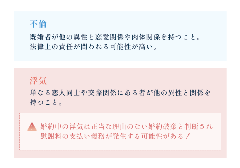浮気が不倫のように法的責任が生じるかどうかは、当事者の関係性によって異なります。婚約関係にある場合は、注意が必要です。