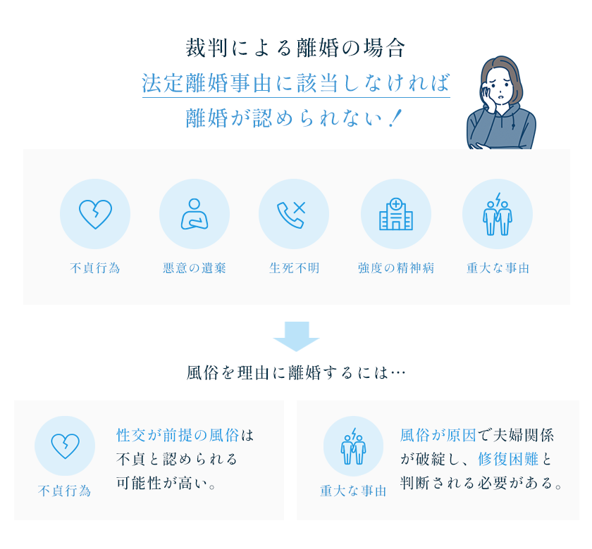 風俗通いの場合、本記事で前述した通り、「不貞行為(民法第770条1項1号)」に該当すれば、離婚が認められる可能性があります。特に、ソープのような性交に至ることが事実上前提となっている風俗は、不貞行為として認められる可能性が高いでしょう。