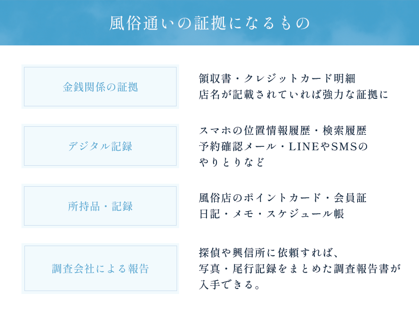 また、スマートフォンの位置情報の履歴や検索履歴、LINEやSMSのやり取り、風俗店の予約確認メールなども、利用の事実を裏づける材料になります。特定の女性と繰り返し連絡を取り合っていたり、店外で会っていた記録が残っていたりすれば、関係が継続していたことを示す証拠にもなり得ます。