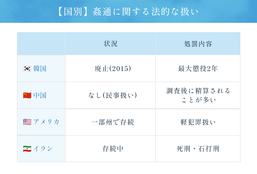 このように、姦通という行為は文化・宗教・法律の違いにより、その評価や制裁のあり方が国ごとに大きく分かれているのが「姦通罪」の実情なのです。