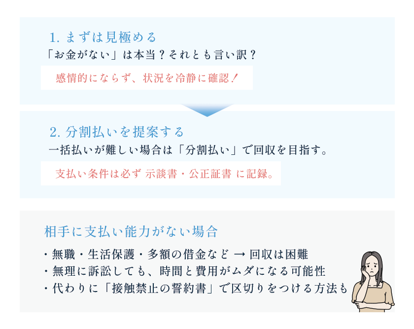 大切なのは、支払えないと思っても請求を無視せずに、まず請求の内容が事実に基づいているかを冷静に確認し、その上で支払い方法や金額について話し合える余地があるかを検討することです。
