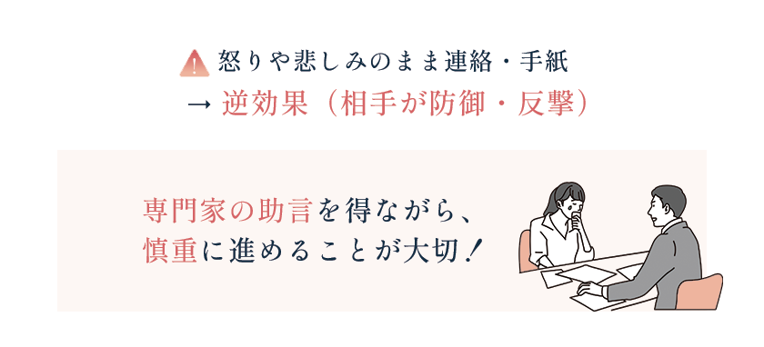 その勢いのままに相手へ直接連絡を取ったり、感情的な内容の手紙やメールを送ったりすれば、相手が防御的・攻撃的な姿勢を取るようになり、交渉がスムーズに進まなくなることがあります。また、やり取りの内容次第では、自分の言葉が相手に利用されてしまう恐れもあるのです。