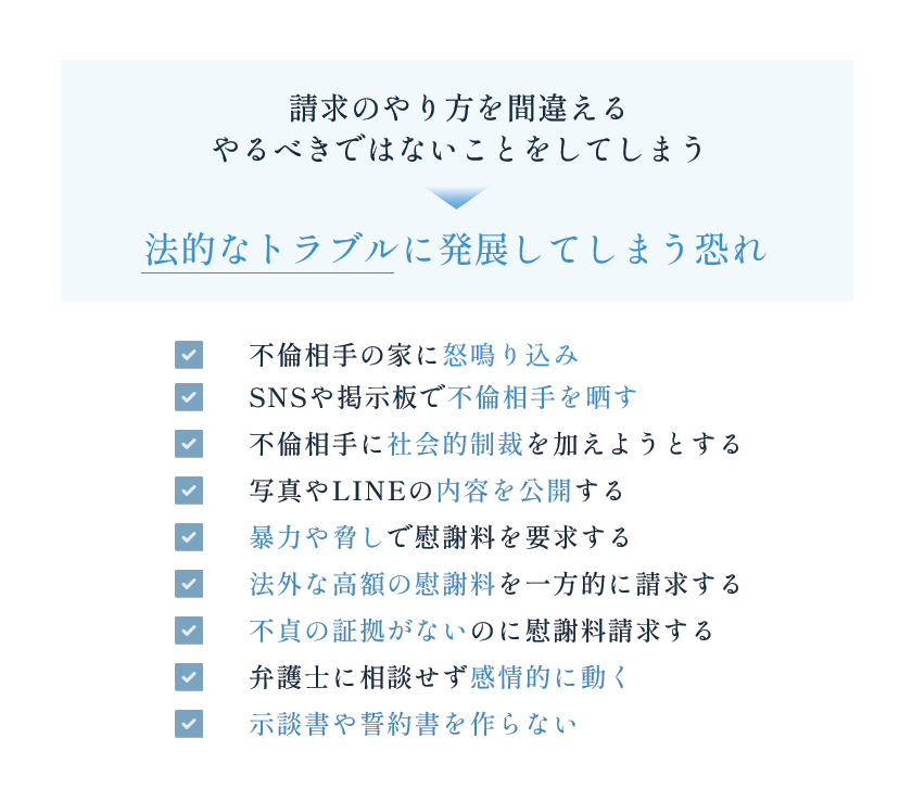 不貞行為を理由とした慰謝料請求は法律で認められた権利ですから、請求すること自体に問題はありません。ですが、その請求のやり方を間違えたり、請求の際にやるべきではないことをしてしまったりすると、法的なトラブルに発展してしまう恐れがあります。