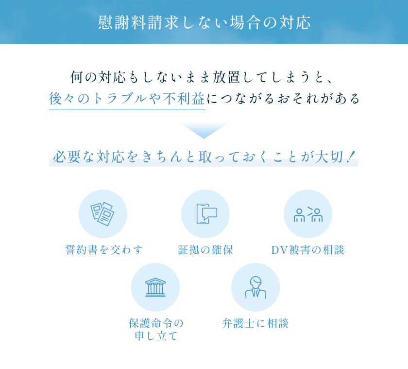 また、慰謝料を請求しない場合でも、誓約書の作成や証拠の保全、安全確保の対応など、適切な備えをしておくようにしましょう。