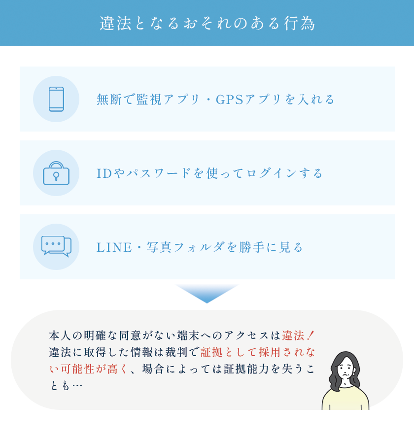 相手の同意なくスマートフォンにアプリをインストールしたり、位置情報やメッセージ内容を無断で取得したりすると、不正アクセス禁止法などの法的トラブルに発展するおそれがあります。