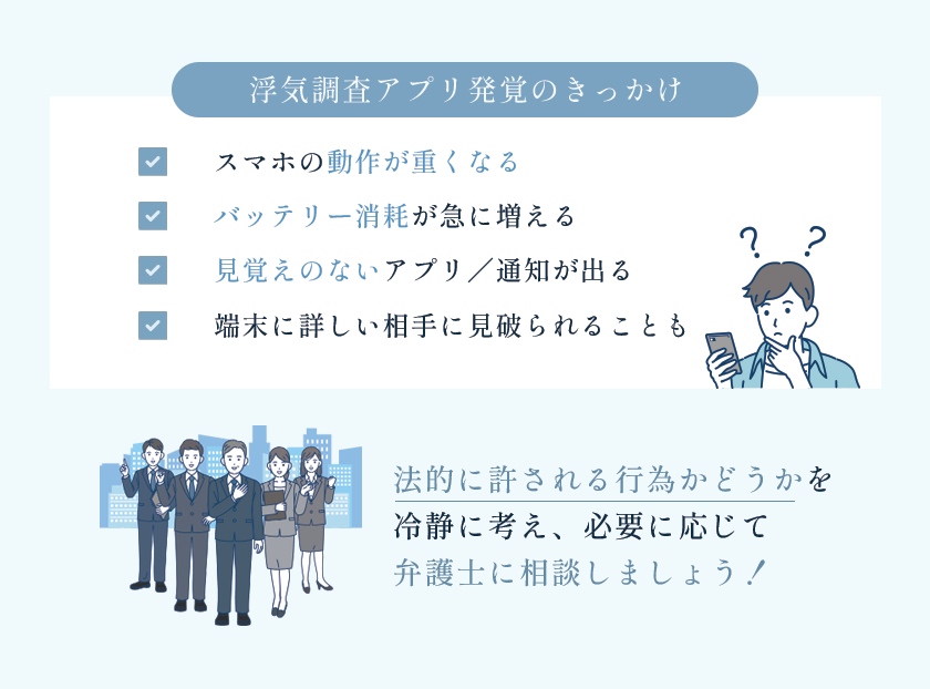 浮気の有無を確かめたいという思いからアプリに頼りたくなる気持ちは理解できますが、バレないかどうか以上に、法的に許される行為かどうかを冷静に考えることが大切です。感情に任せて違法な手段に踏み込んでしまう前に、必要に応じて弁護士に相談していただくことをおすすめいたします。