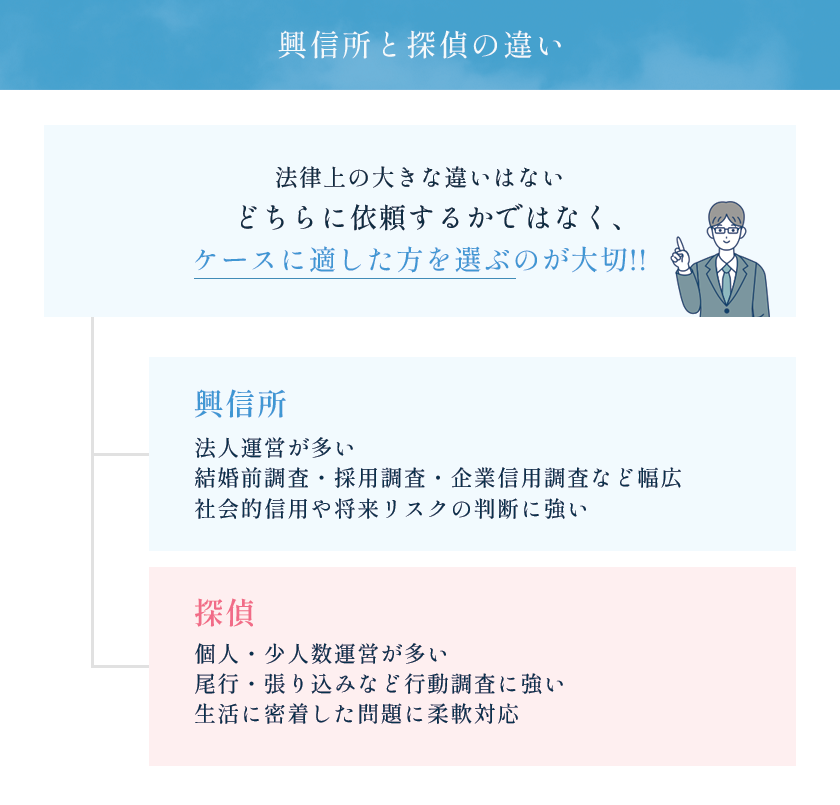 このように、興信所は「社会の安心に関わる信用調査を幅広く手がける組織」、探偵は「目で見る調査・生活に密着した問題に対応する事務所」という印象の違いがあります。ただし、両者の業種や業務内容に明確な違いはありません。