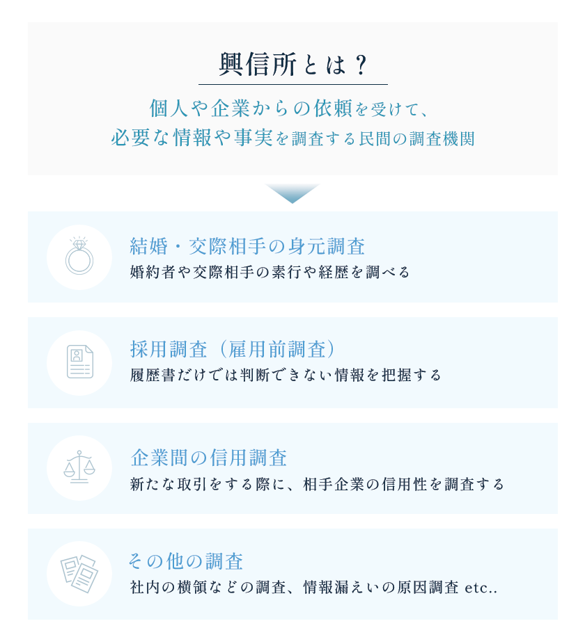 興信所という名前は、「信用を興す所」という意味から来ています。