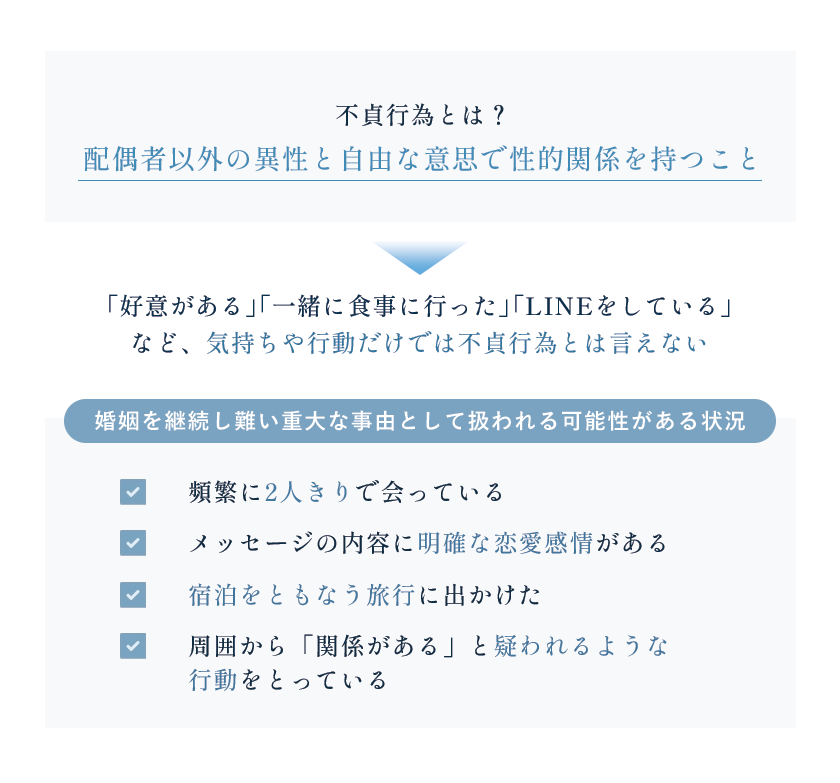 不貞行為とは、法律上「配偶者以外の異性と自由な意思で性的関係をもったこと」を指します。つまり、単に好意を抱いたり、気になる異性と食事に行ったりするだけでは、不貞行為には該当しません。