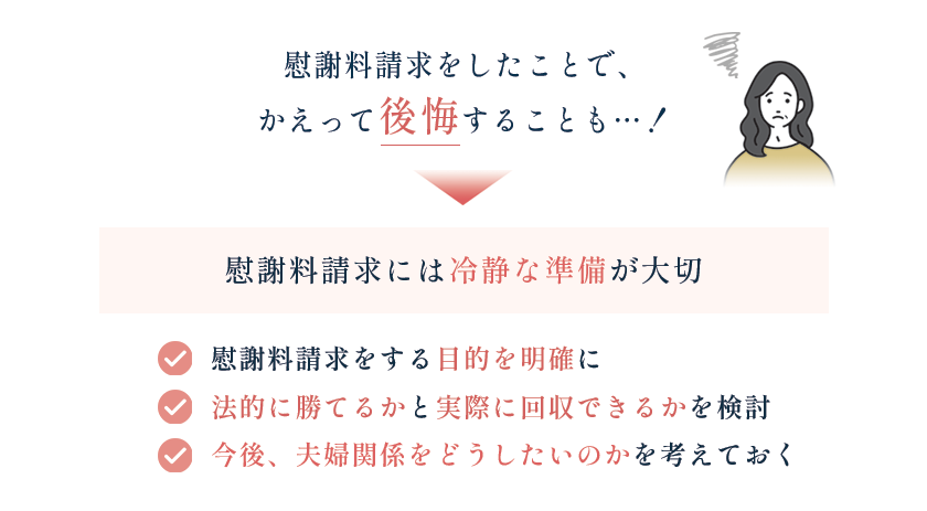 たとえば、金額が想定より低かった、相手との交渉が長引いた、請求をきっかけに夫婦関係が悪化したなど、さまざまな要因で後悔することがあるのです。