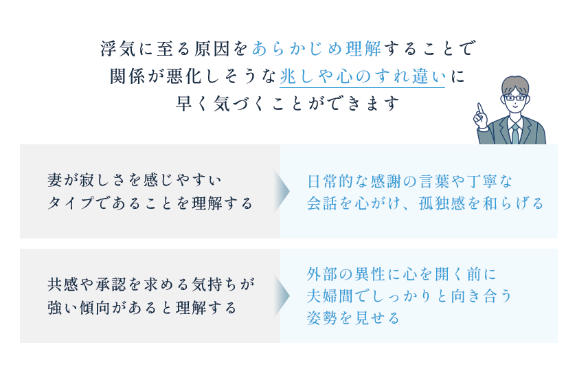 A:浮気に至る原因をあらかじめ理解しておくことで、関係が悪化しそうな兆しや心のすれ違いに早く気づくことができ、未然に対処することが可能になります。