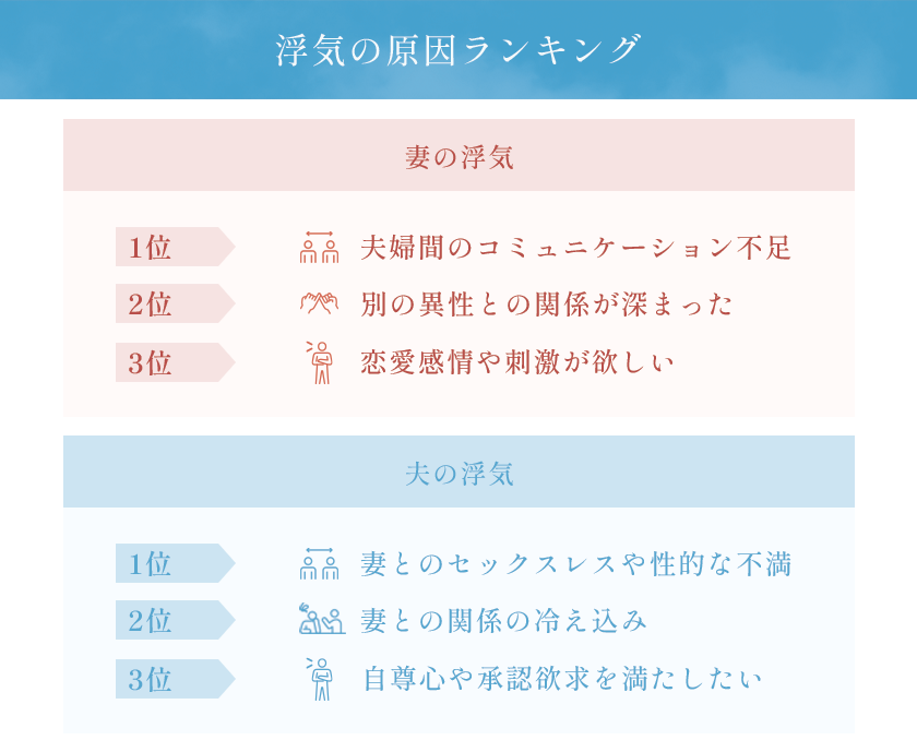夫の浮気の原因として代表的なものをランキングにしてみますと、一般的には次の通りとなります。