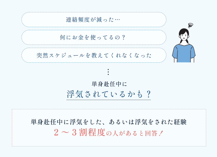 慣れない仕事環境や生活リズム、頼れる人のいない不安定な日常が続くと、強いストレスを抱えるようになります。そのストレスのはけ口として、誰かに甘えたり、非日常的な刺激を求めたりするうちに、気付けば浮気してしまっていたというケースも見受けることがあります。