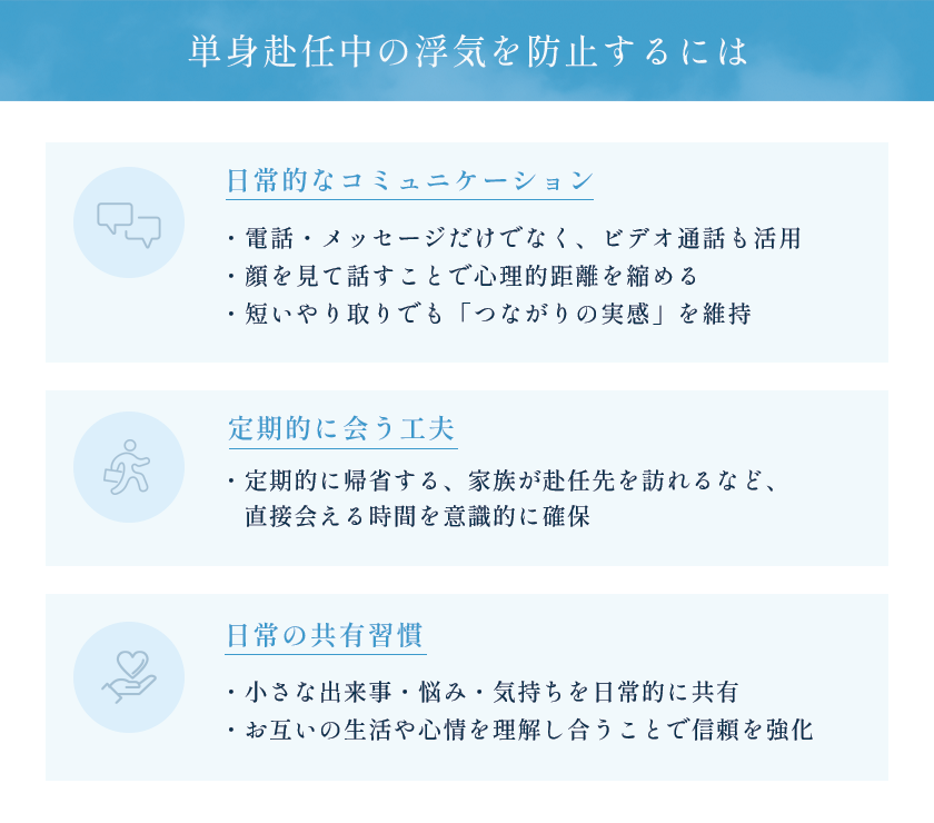 このように、単身赴任中の不倫を防止するには、日頃から夫婦の信頼関係を築いておくことが重要です。